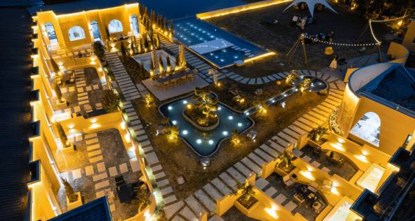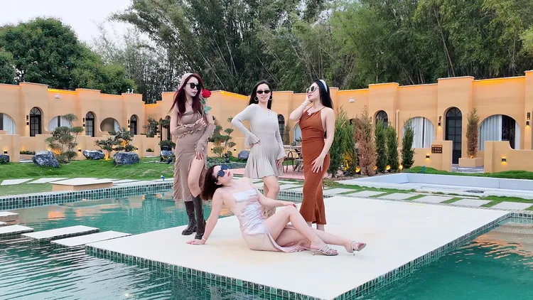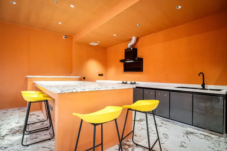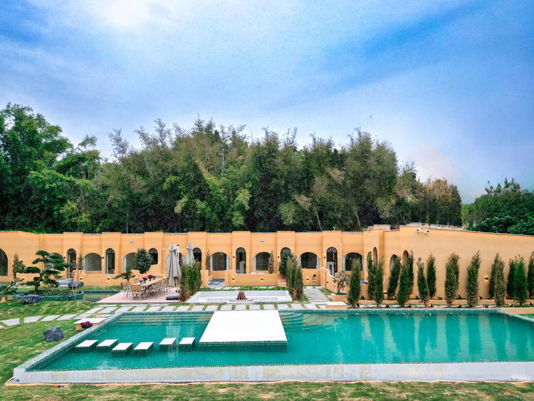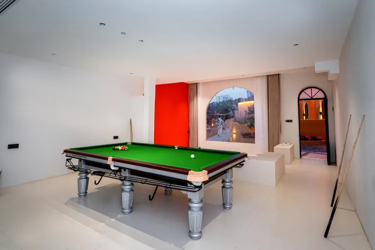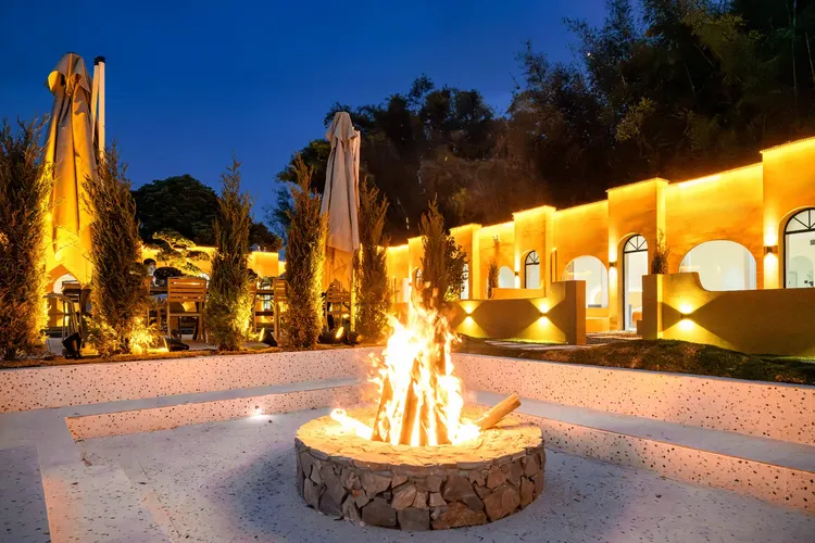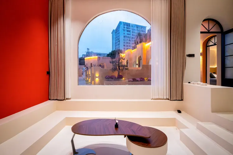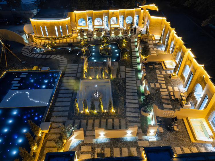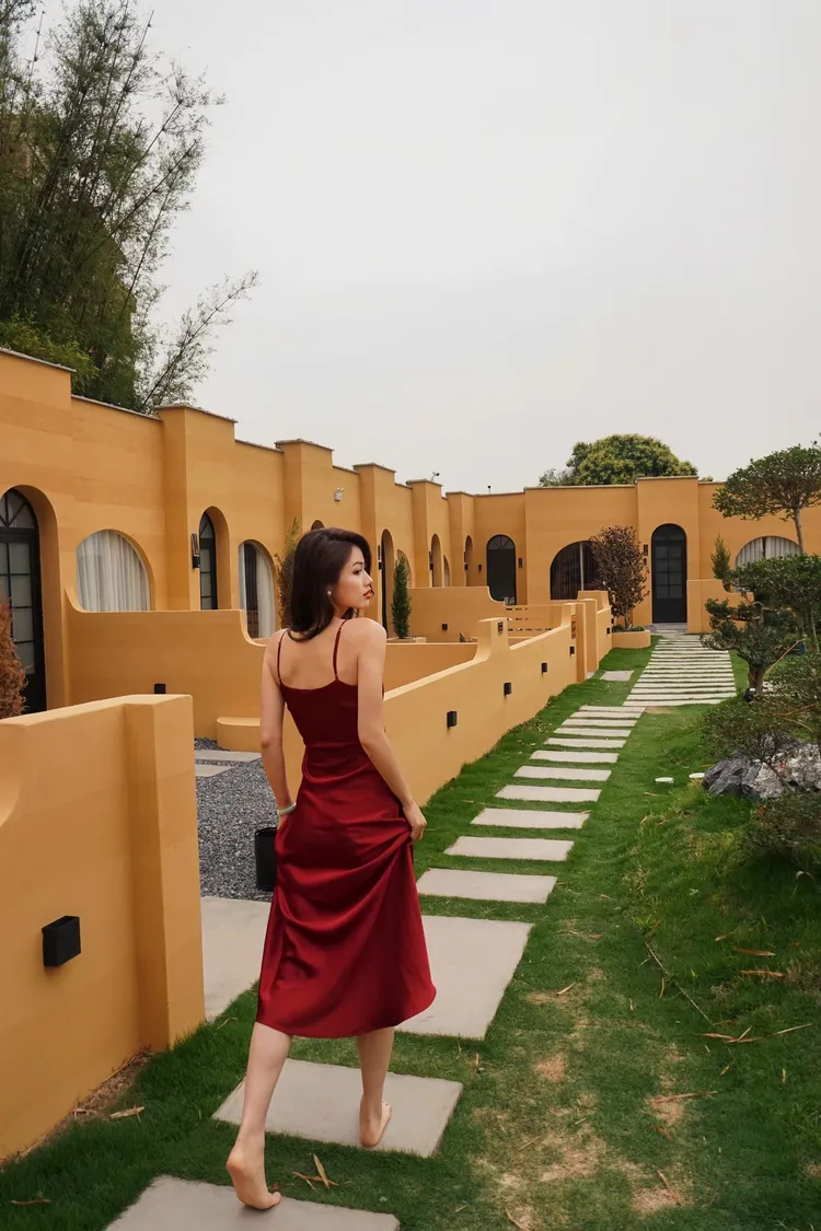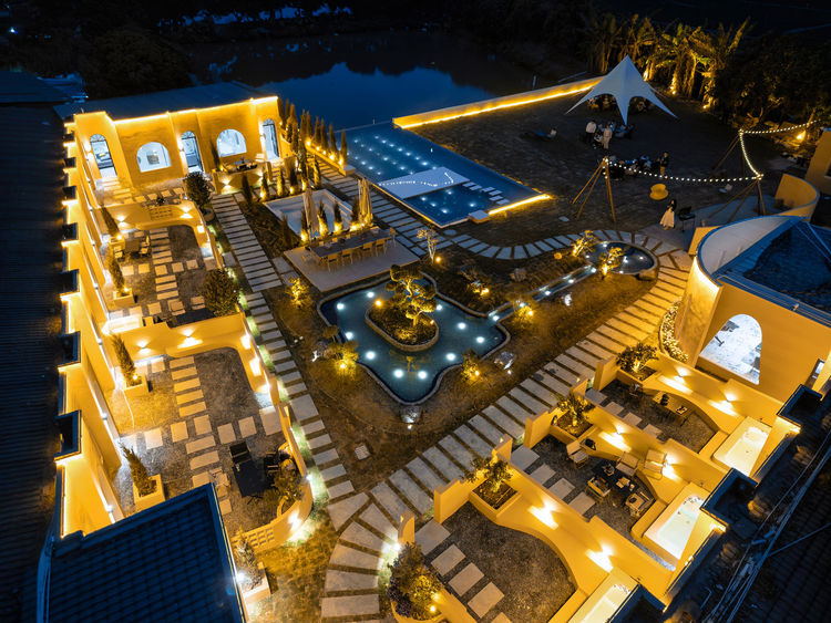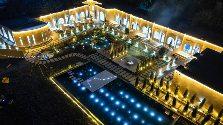 多巴胺黄撞色建筑搭配蓝天白云绿湖,白日邂逅北非异域风情,夜晚灯光璀璨,随手拍都是氛围感大片;17 房 35 床超大容量,一户一私汤的私密体验,搭配 17 米满天星无边泳池、通宵派对 KTV、专业电竞房等全能配套,还有 50 人会议区、开放式厨房、篝火区等多元空间。