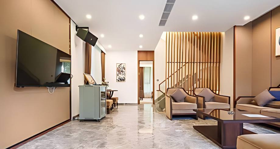 配套设施齐全且免费使用:私家花园、客厅 KTV(22:00 前可用)、自动麻将机、家庭式厨房(含电磁炉、炒锅等),还提供电烧烤炉(食材调料自备),24 小时热水、免费 WIFI 和一次性洗漱用品齐全,配备 24 小时贴心管家服务。